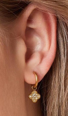 Hoe schattig zijn deze oorbellen! Perfect voor dagelijks gebruik. Ze zijn rvs met een klavertjevier, zirkonia's en creolen. Alleen beschikbaar in het goud.